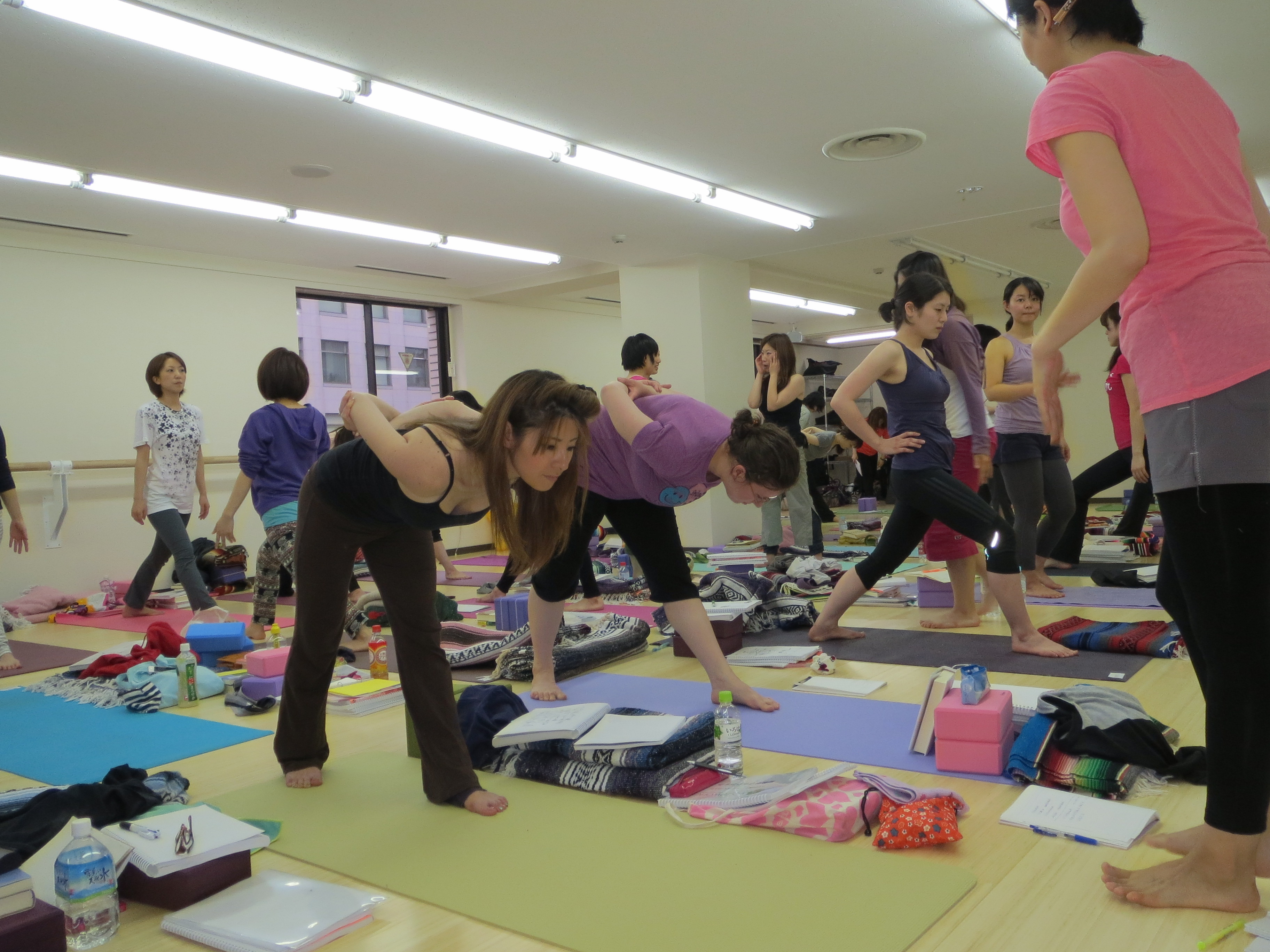 As I’ve mentioned, there are 28 students enrolled in the program. This would be challenging under any circumstances, but more so, if you consider the language obstacle and the tedious process of translating every word exchanged between me and the students. However, in spite of this fact, they are amazing! All of them are kind, gracious and very enthusiastic about learning yoga and seem really happy to be in the program. There is one man and one American woman participating (she commutes two hours to get there). The students have great respect for Yogaworks and what the program has to offer. It’s been touching to realize this and I feel extremely honored to be leading this training. We’ve completed two weekends so far and only one person had to drop out—-work commitments. Regardless, 28 is more than enough to work with. We are going to spend lots of time together and I want to get know them, learn their names and hopefully inspire them to teach. They said I will definitely learn how to speak Japanese!