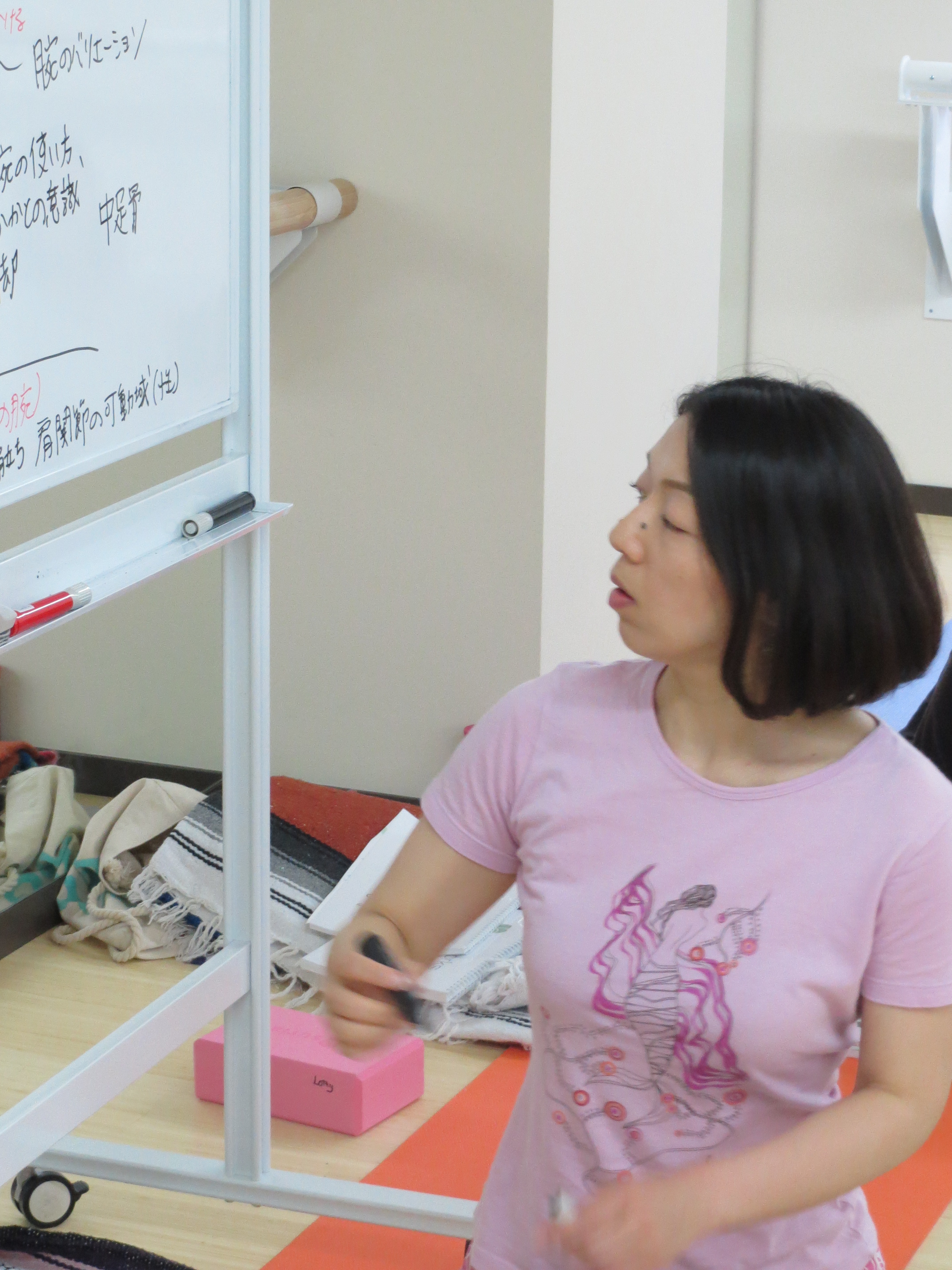 Initially I wanted to begin the segments on “The Translators” with Tomoko Kawahara because she has the most demanding role. In addition, Tomoko is also the woman who all of the other translators look up to—Souffler, Yuri & Kosai. But, it makes sense to highlight her towards the end of the training because over these weeks I’ve grown to view her as more than a translator, she is a co-teacher. Calm, authoritative and patient, her presence in the classroom is reassuring—-she is the “glue” that keeps things together. Without her there simply would be no training. Tomoko also brings balance to the intensity of the training, reminding us to take breaks and brings me chocolate from time to time. I send her the schedule beforehand so that she knows what’s on the agenda and then she tirelessly speaks every word I say each Saturday & Sunday from the morning practice, throughout the lectures, and until the final closing circle at the end of the day. She interprets each question the students ask me and my responses. I’m amazed at how it works, we just get into a rhythm and the day flows without any conflict–its fascinating. I’ve now learned that a translator has to have specific skills and talent to make it work–the love of language, extensive traveling experience and a healthy curiosity about other cultures. Furthermore, the translation process is a collaborative effort. I look to Tomoko for advice and strategies on presenting material or insight when communicating with the students. She’s also my cultural link which I feel has been instrumental in keeping this training flowing smoothly. There are phrases, words or concepts in English that may not be present in Japanese and she has to find a comparable interpretation.